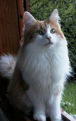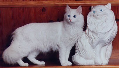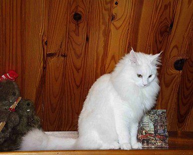 C’est en juin 1994 que j’ai eu ma première angora turc, une femelle blanche aux yeux bleus. Je l’attendais depuis un moment et le jour où elle est arrivée j’étais comblée de joie. Puis très vite, ma joie s’est transformée en angoisse. La chatte était malade : coryza, gale des oreilles, teigne, problèmes de peau importants, puis pneumonie. Je vous épargnerai tous les détails, mais en conclusion il aura fallu un an pour que cette petite bête ait complètement récupéré. Ah, j’allais oublier, elle était sourde aussi ! Ma première intention était qu’elle ait une portée avant de la faire stériliser, mais pour cela il me fallait lui trouver un mâle et comme il était hors de question de remettre les pieds là où je l’avais prise, j’ai décidé d’en acheter un. C’est en Belgique que je l’ai trouvé en 1995, une jeune éleveuse très sérieuse, qui avait un petit élevage familial, m’a vendu un superbe mâle red mackerel tabby et blanc (Léo) et par la même occasion j’ai pris une autre petite femelle blanche aux yeux or (d'une autre portée) car elle passait ses journées avec Léo et je ne voulais pas les séparer. |